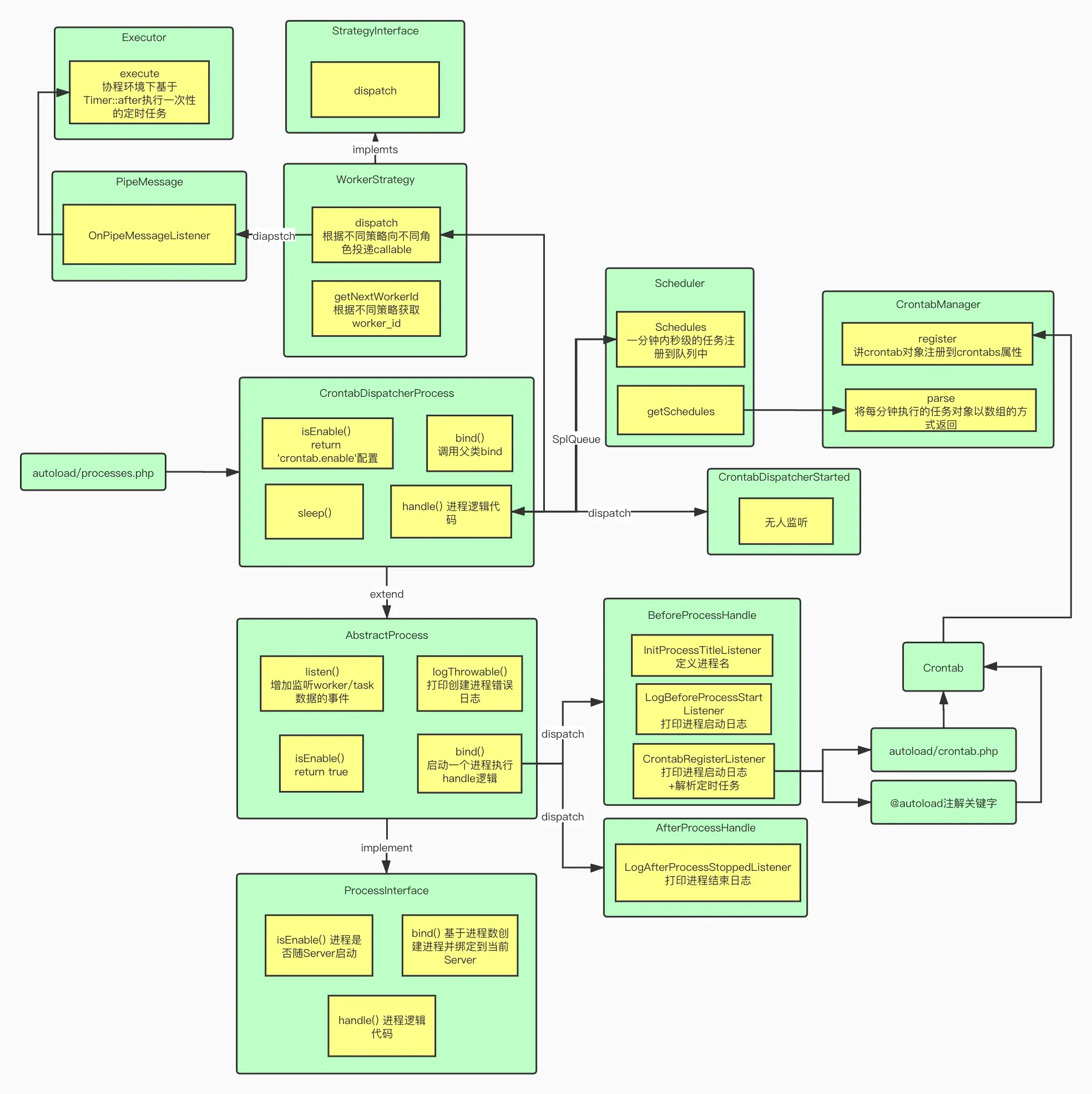 以上大致就是一个crontab定时任务的执行流程,当然里面还有很多执行细节和Contab个性化的定义参数由于篇幅有限我们还没来得及介绍,感兴趣的同学可以私下进行阅读,下面我也附上来Hyperf/Crontab的整体执行流程类之间的关系图,方便大家对照着阅读源码。