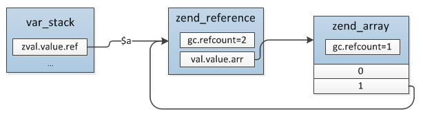 zval *refcounted; /* 引用计数指针,对于引用计数为1的变量,此字段为NULL */