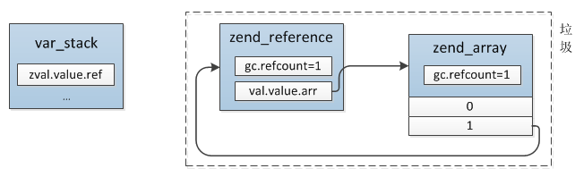 简单的描述就是变量的内部成员引用了变量自身,比如数组中的某个元素指向了数组,这样数组的引用计数中就有一个来自自身成员,试图释放数组时因为其ref_count仍然大于0而得不到释放,而实际上已经没有任何外部引用了,这种变量不可能再被使用,所以PHP引入了另外一个机制用来处理变量循环引用的问题。这就是GC(Garbage Collector)
