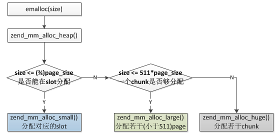 Zend定义了三种粒度的内存块:chunk、page、slot,每个chunk的大小为2M,page大小为4KB,一个chunk被切割为512个page,而一个或若干个page被切割为多个slot,所以申请内存时按照不同的申请大小决定具体的分配策略: